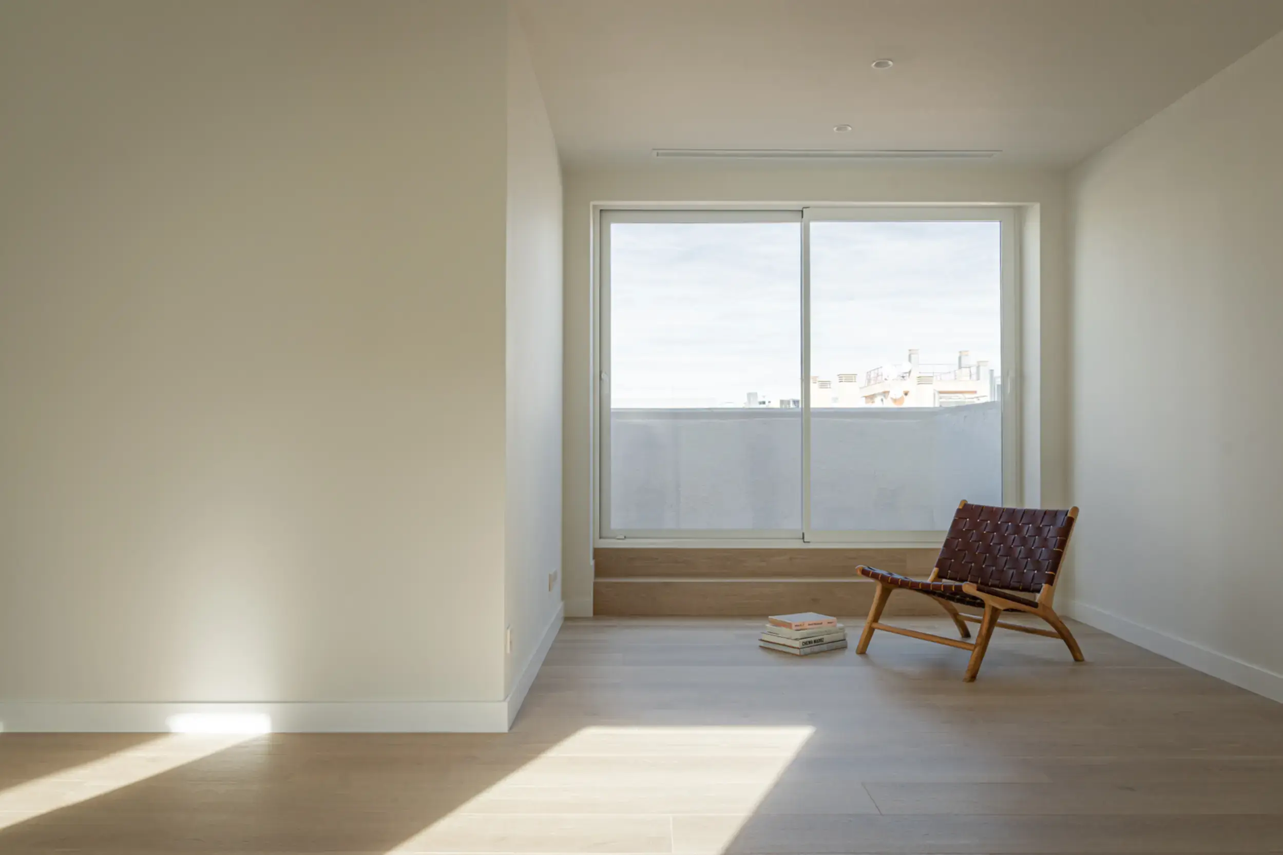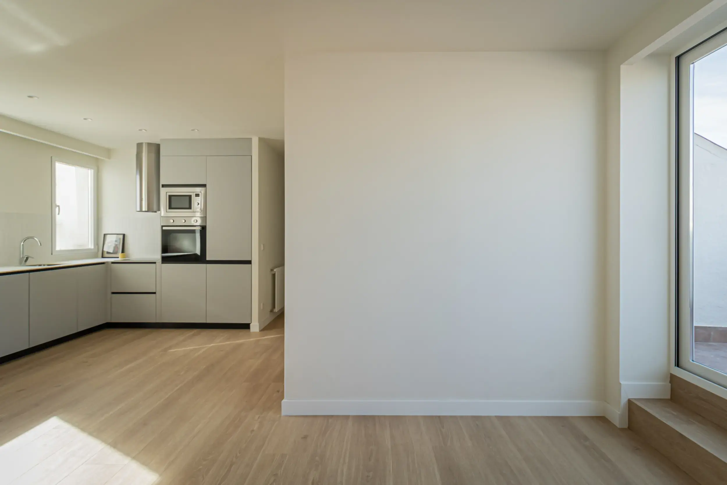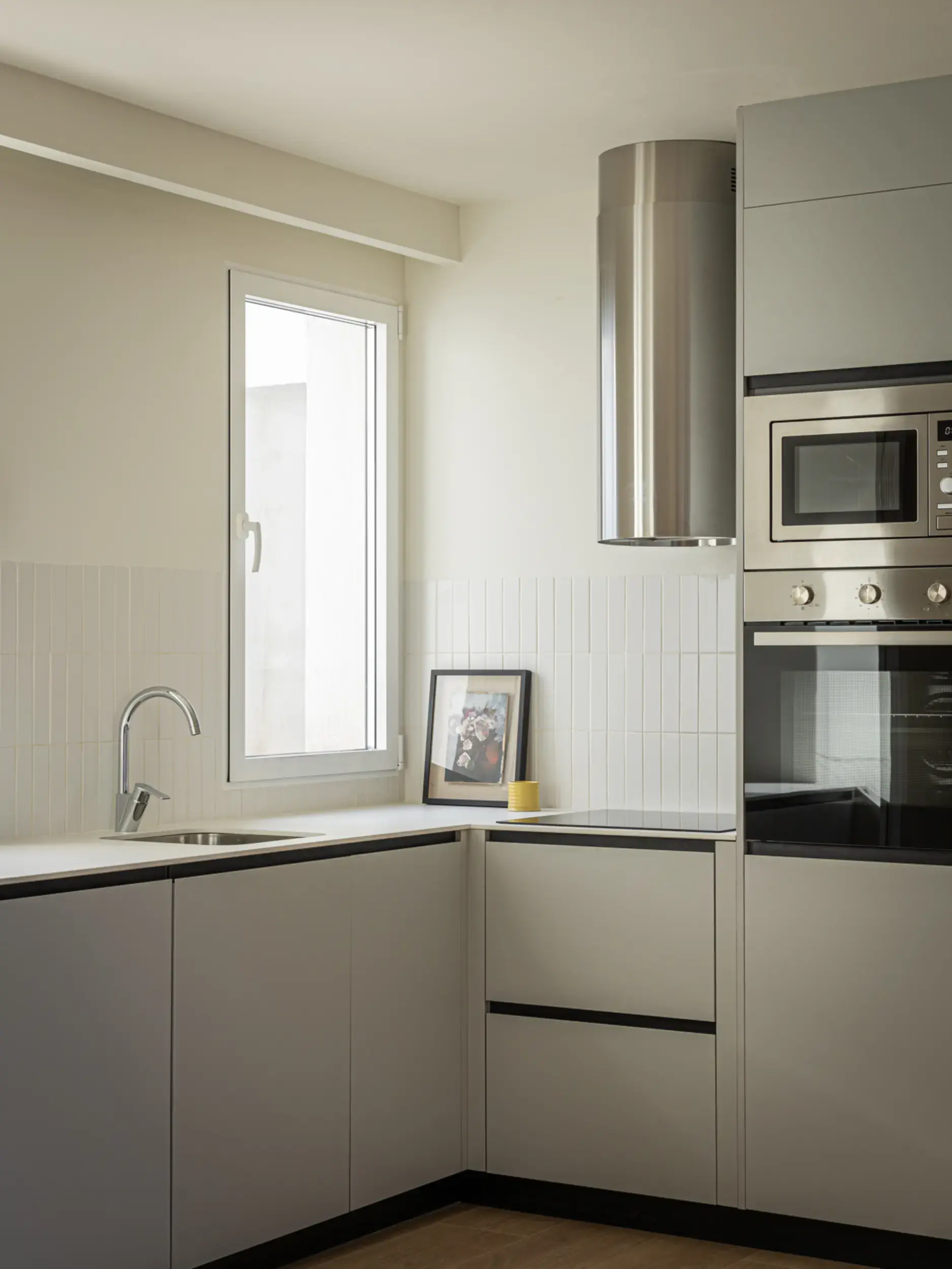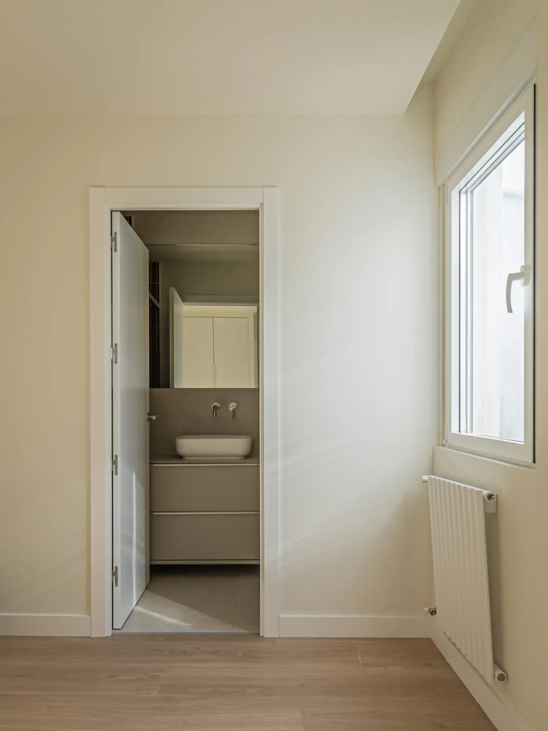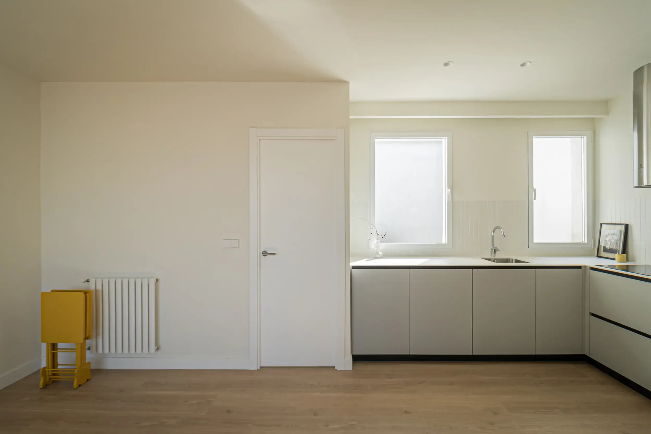 Reforma integral de un piso de 65m2, donde se invierte por completo la distribución original de la vivienda. El salón y la cocina abierta se trasladan a la fachada exterior, en busca de luz natural y amplitud, generando una conexión con el espacio exterior. Los dormitorios quedan en las zonas interiores buscando calma. Se abre por completo el espacio respecto a la distribución original, dotando al piso de una gran luminosidad.